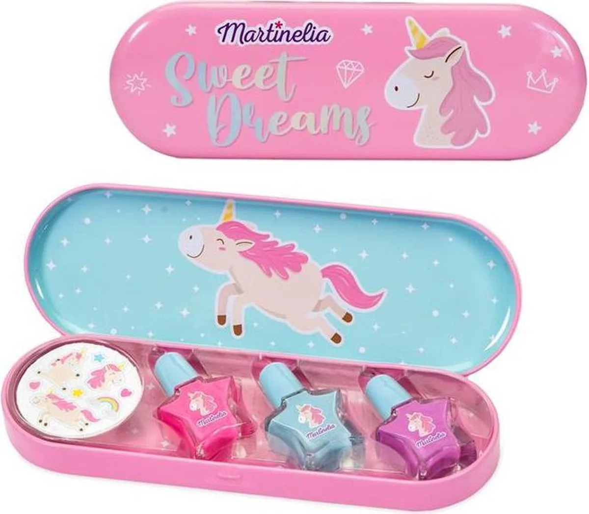 Комплект лакове за нокти и стикери, Martinelia, Еднорог, Метална кутия