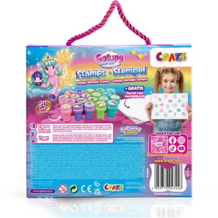 Всеки печат има капаче, което предотвратява изсъхването на миещото се мастило. Детската кутия за печати CRAZE GALUPY Mermaid ще накара сърцата на всички малки фенове на Galupy да бият по-бързо!
