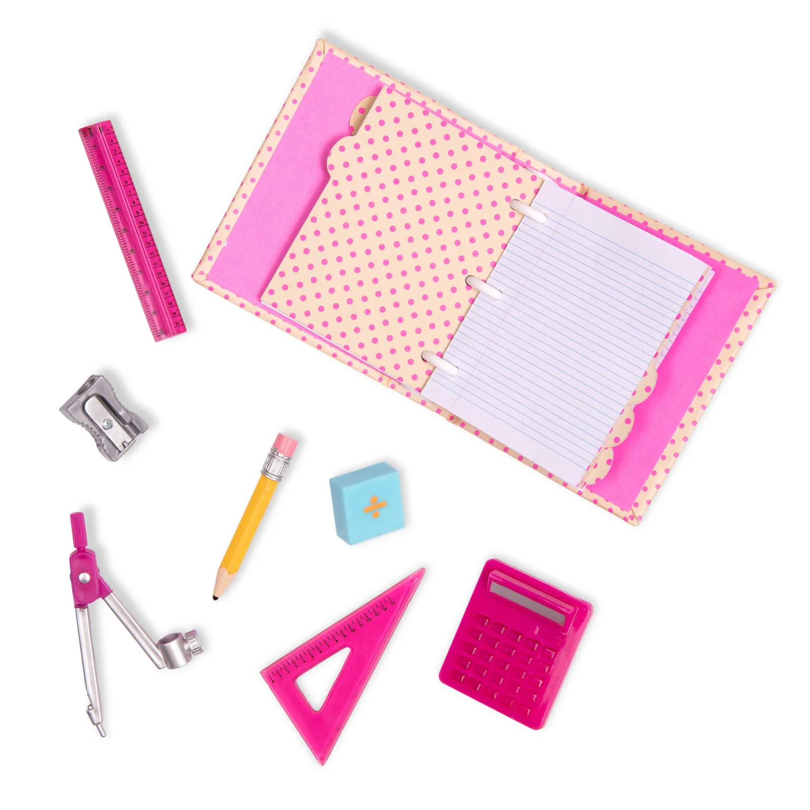 Посетете следващия си час с комплекта за класна стая Our Generation! Тези училищни пособия са с реалистични детайли за повече забавление от играта на преструвки и са точно с правилния размер, за да ги държат в ръцете ви 46-сантиметровите кукли. Отворете цветната папка и организирайте бележките си с 5-те разделителя за страници и 5 листа хартия. Пръстените се отварят лесно, за да добавяте или премахвате страници, така че куклите ви да могат да поддържат домашните си подредени! Време ли е за бърз тест? Използвайте калкулатора, за да решавате математически уравнения по време на теста. След това вземете линийката, пергела и триъгълника от комплекта за геометрия, за да рисувате фигури. Не забравяйте да подострите молива си!