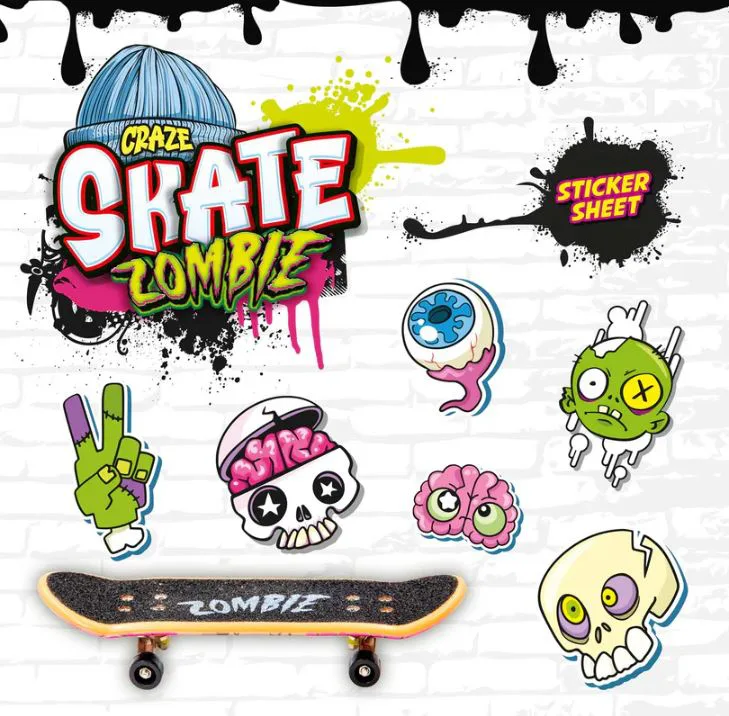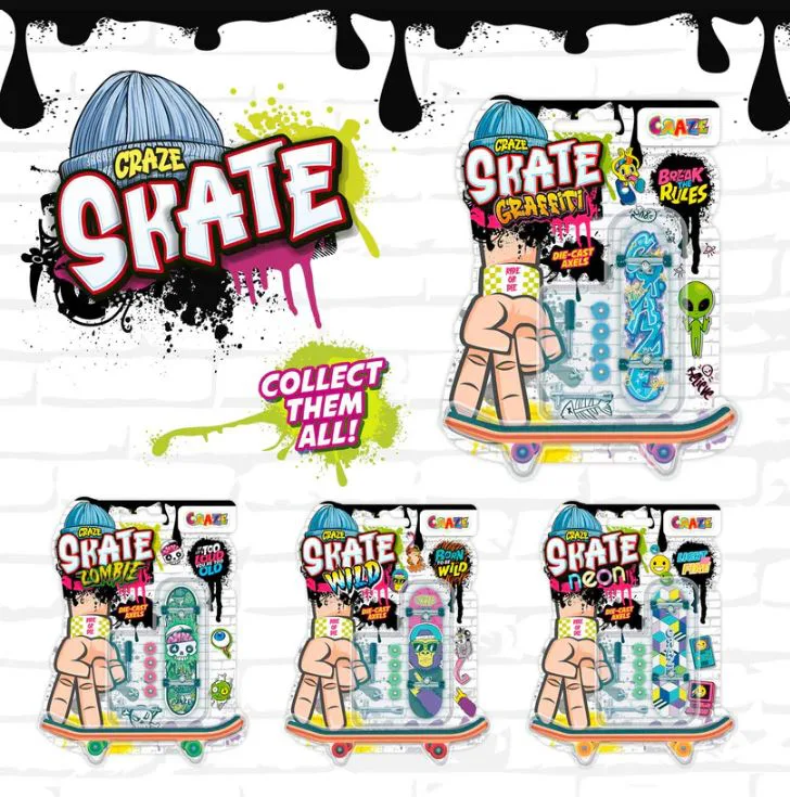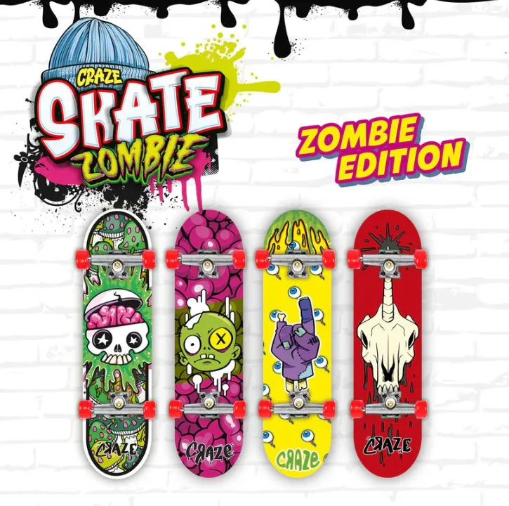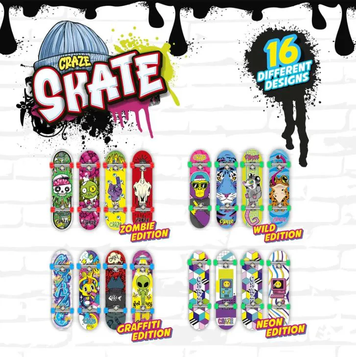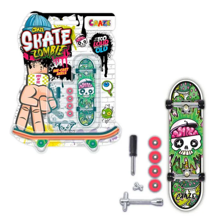 Пригответе се за пързаляне с CRAZE SKATE, напълно сглобен скейтборд за пръсти, идеален за ентусиасти на скейтборда от всички възрасти! Всеки пакет съдържа невероятен скейтборд за пръсти с метални оси и уникален дизайн. С общо 16 различни дизайна, колекцията включва 4 вълнуващи теми: Зомбита, Графити, Диво и Неон.