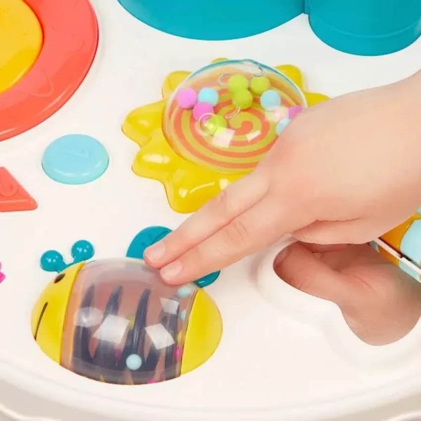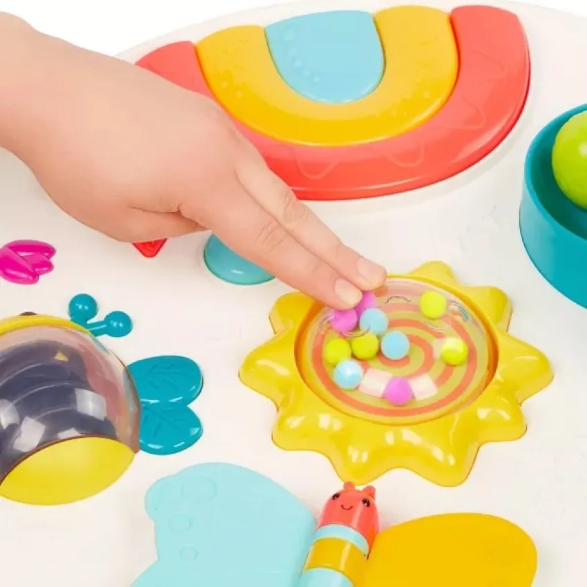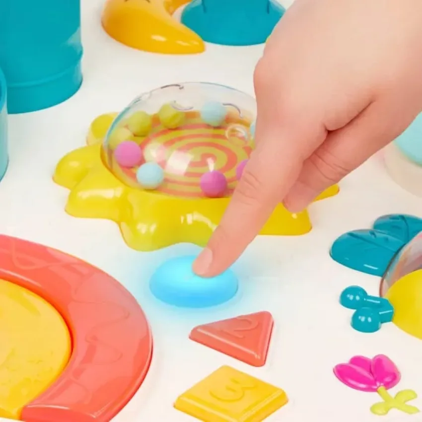 Научете за числата с 1-2-3 бутона, разлистете крилете на книгата с пеперудата, свирете на светещото пиано, гледайте как топките се въртят на слънцето, накарайте още топки да се търкалят по пързалката, включете ярката луна и завъртете пчелата, за да накарате мънистата да дрънчат.