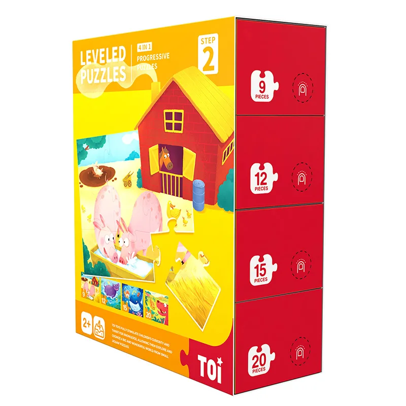 Интригуващ комплект, подходящ за най-малките. Състои се от 4 пъзела, представящи различни забавни сцени с животни. Пъзелите са с различен брой елементи – 9, 12, 15 и 20.