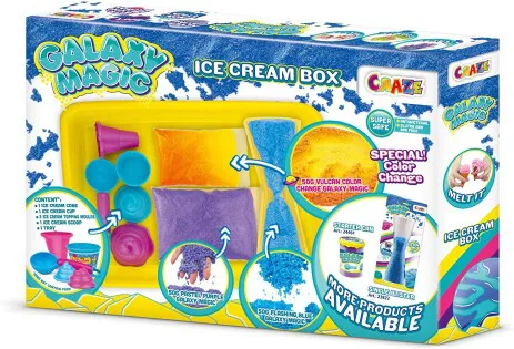 Разноцветен, мек,забавен Galaxy Magic. Направете сладоледени изкушения за всички. Предлага безкрайно завладяващо моделиране и забавление. С него ще можете да се създадете пухкави меки форми многократно. Без мирис, без BPA и глутен. Дерматологично тествани от T?V Rheinland, и са оценени с “Много Добро”. Продуктите от тази категория не оцветяват кожата или текстил. Съдържа 150 гр. в 3 различни цвята, 5 различни форми.