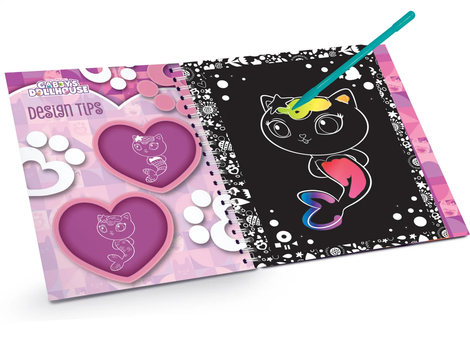 Открийте магията на цветовете със скречбука на Габи. Забавлявайте се, оцветявайки и декорирайки всички картинки, като издраскате черната повърхност с включената химикалка и откриете много искрящи и цветни ефекти.