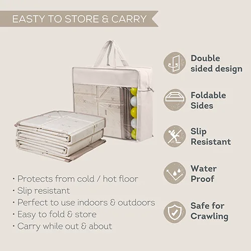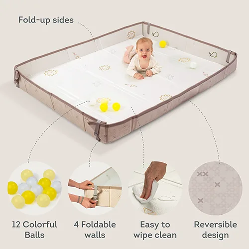 Тази просторна постелка за игра разполага с 12 цветни топки и предлага водоустойчива, ултра мека повърхност, която е нежна към кожата на бебето. Уникалните сгъваеми стени създават безопасна зона за игра, като държат играчките и топките вътре, като същевременно карат бебетата да се чувстват сигурни. Освен това може да се сгъне за лесно преместване и удобно съхранение. Размер: 150 x 180 см