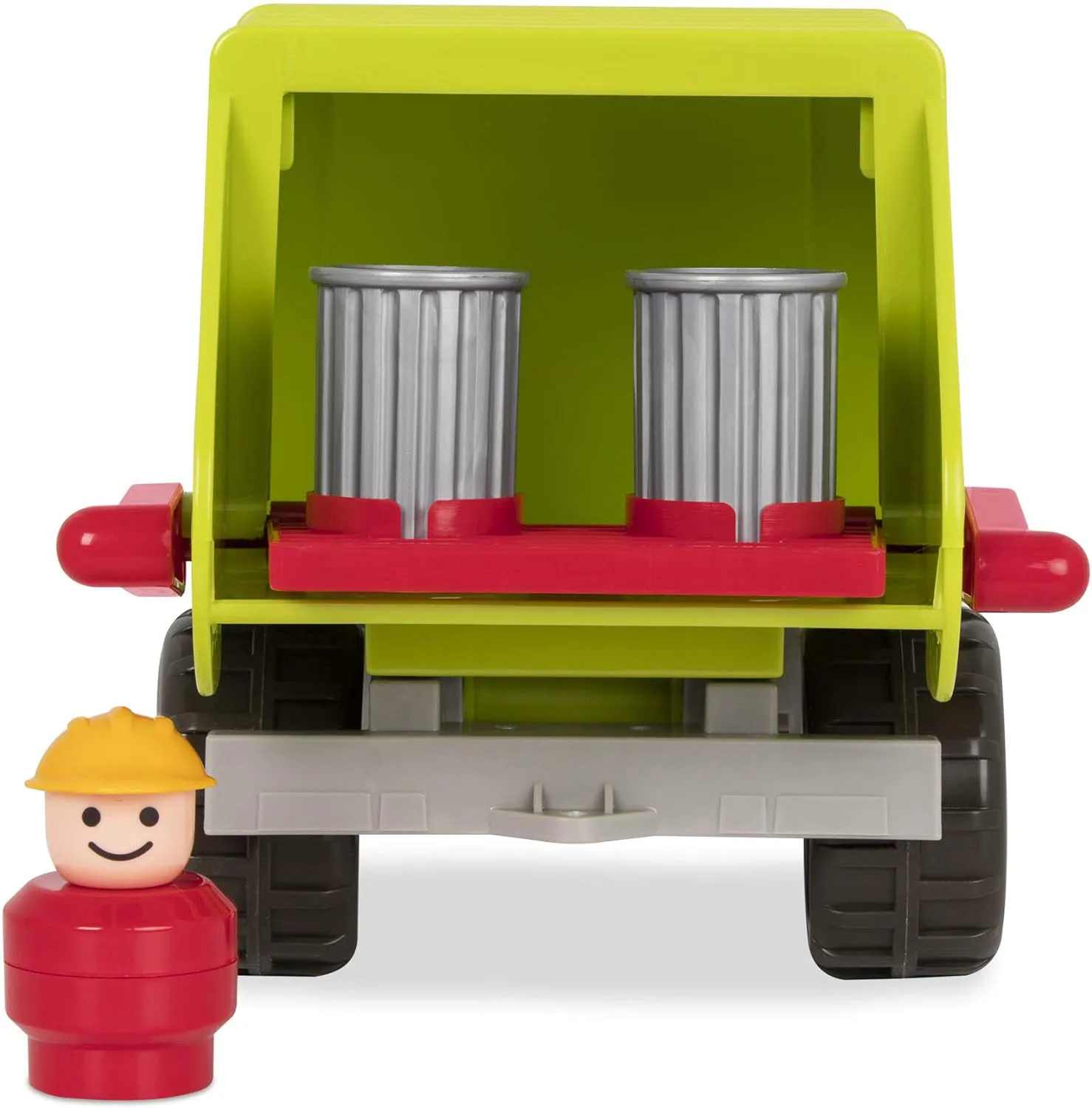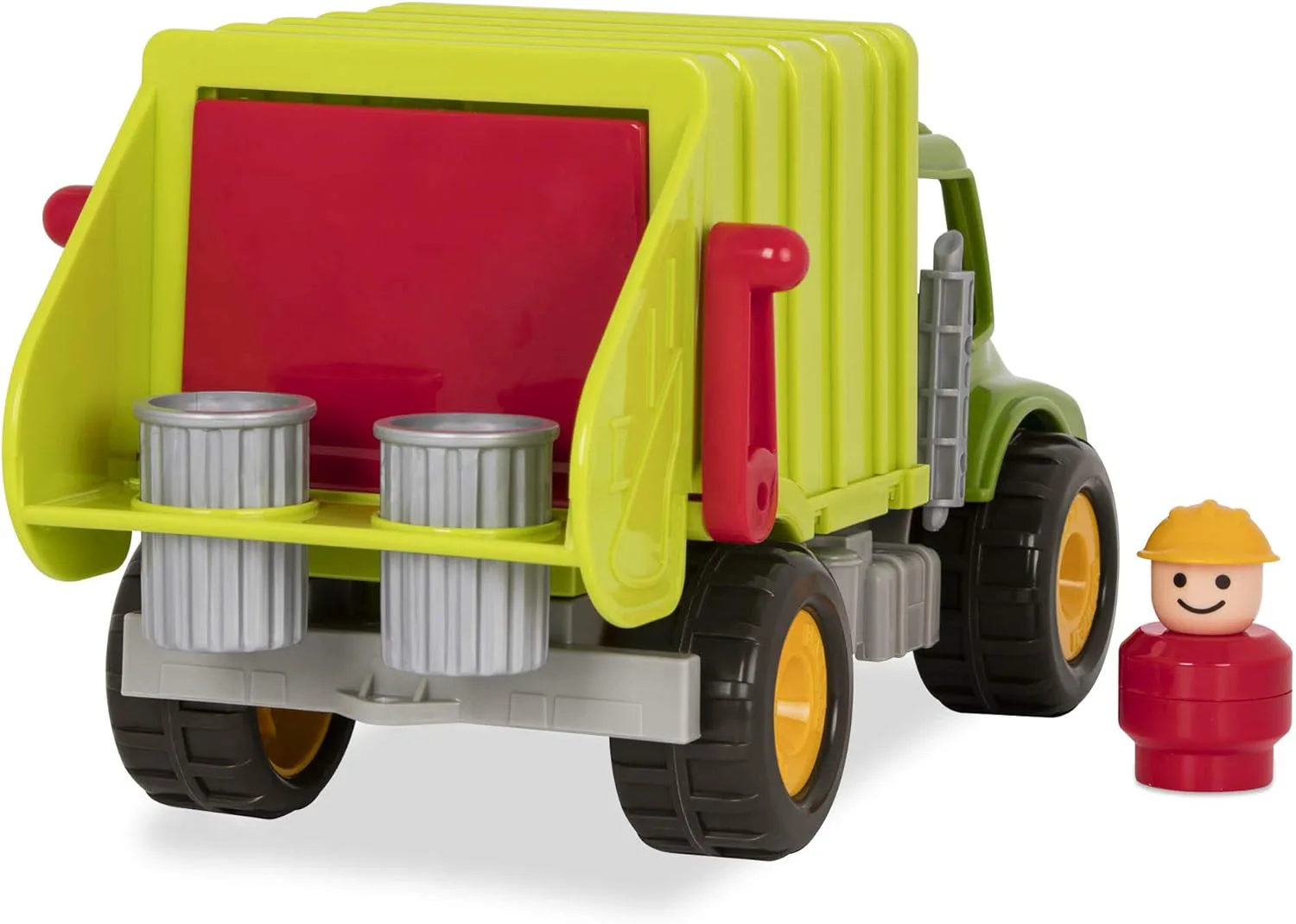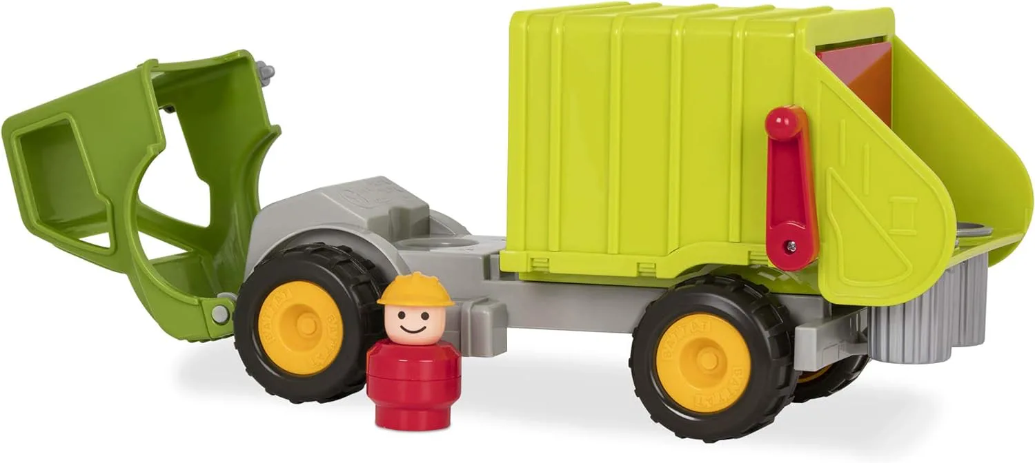 Включен шофьор: дружелюбният шофьор на рециклиращ камион играчка знае маршрута напред и назад.