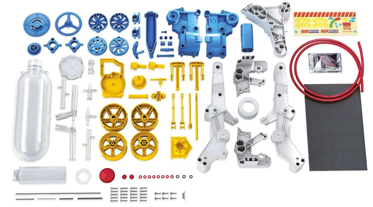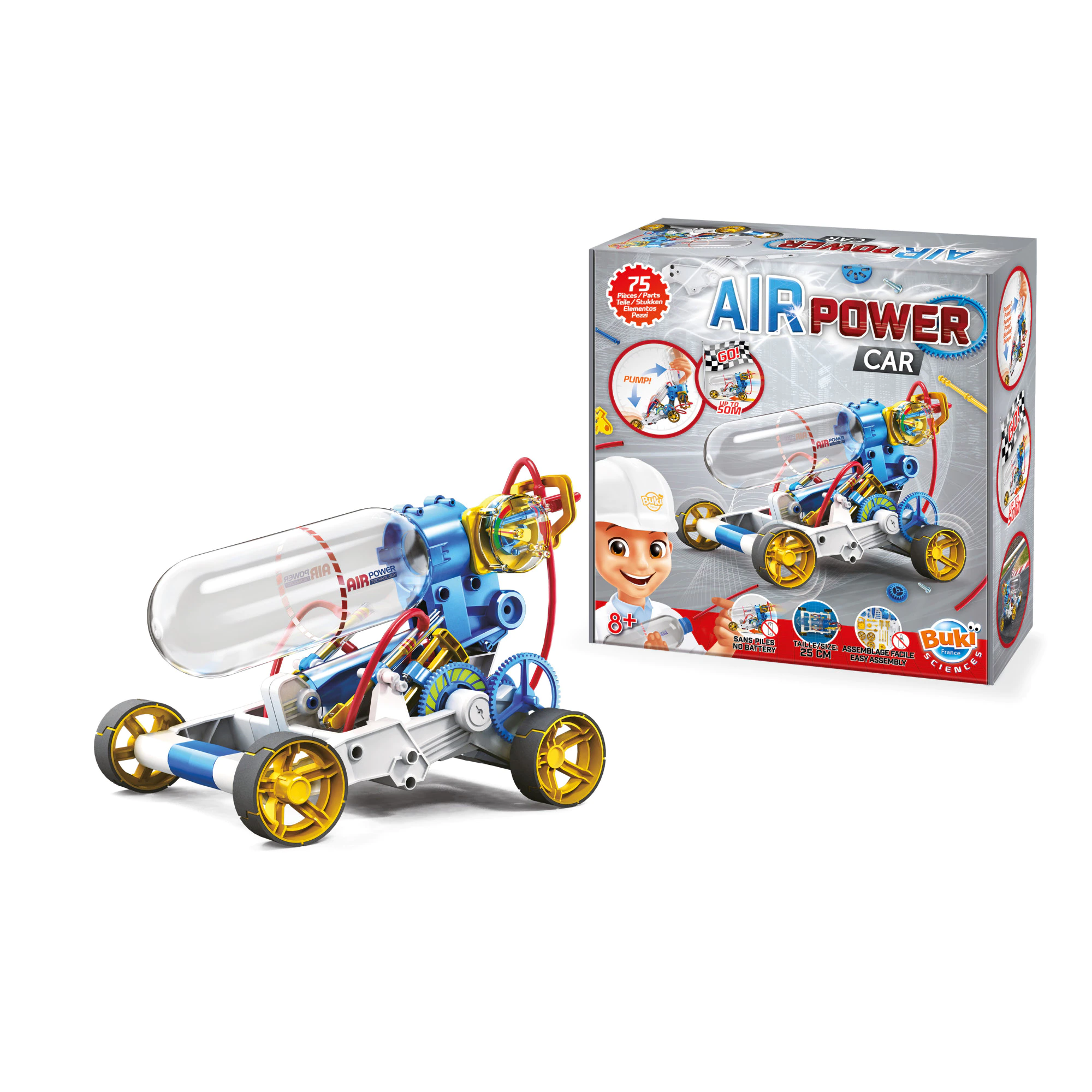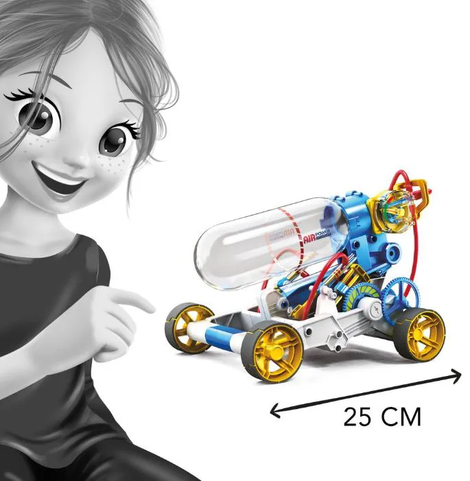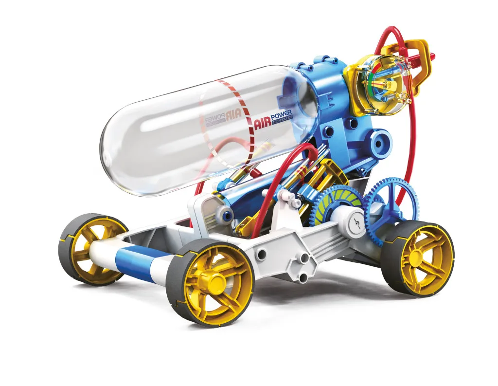 Поставете частите заедно и изградете превозно средство, задвижвано от сгъстен въздух. Просто използвайте помпата, за да запълните уреда за сгъстен въздух. Когато индикаторът свети в зелено, автомобилът е готов за потегляне! Комплектът съдържа инструкции с цветни илюстрации.