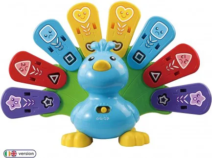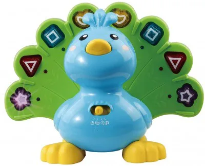 Интерактивен паун, който помага на децата да научат цветове, форми, числа и емоции. Разполагате с 8 осветени бутона и 8 пера за емоции, които предизвикват различни реакции. Натиснете клюна на паун, за да го чуете как пее и говори. Включва 3 режима на игра, проучване, учене и музика. Насърчава езиковото развитие и въображаемата игра.