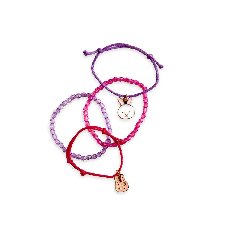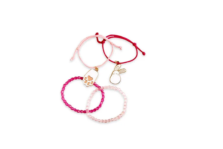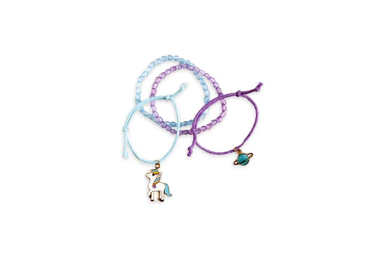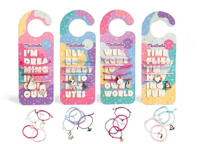 Всеки блистер във формата на закачалка за врата съдържа 4 гривни в различни цветове и мотиви. Намерете разнообразие от цветове, включително розово, фуксия, лилаво, синьо и лилаво, както и асортимент от висулки еднорог и зайче. Смесвайте, съчетавайте и ги съберете всичките! Продуктът е асортиментен и не може да бъде избиран точна разновидност. Доставката се извършва според наличностите на случаен принцип.