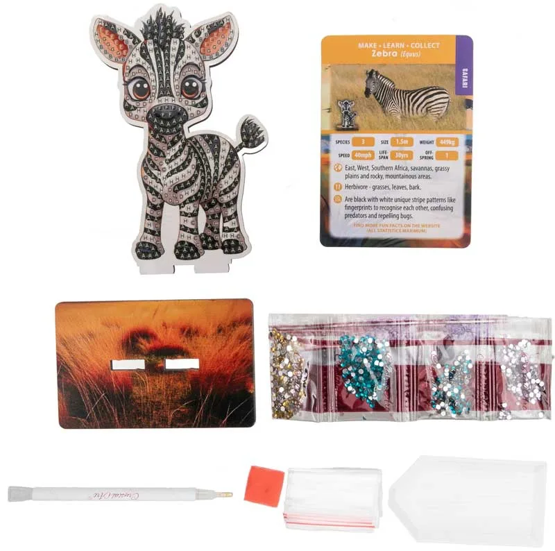 Плик с кристали и плик с цип Всяка фигурка е с размер приблизително 11 cm и се доставя с основа с ширина приблизително 8 cm. Дървеният шаблон и основата са изработени от лазерно изрязан шперплат. Подходящо за възрастни и деца над 6 години