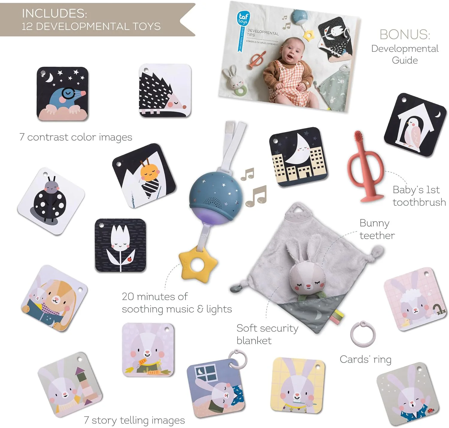 През първите няколко месеца след раждането вашето новородено едва започва да разбира как да използва сетивата си и да опознава света около себе си. Нашият комплект за новородени е специално проектиран да предостави на родителите най-необходимите играчки за развитие, които ще гарантират, че бебето получава цялата необходима подкрепа по забавен и здравословен начин.