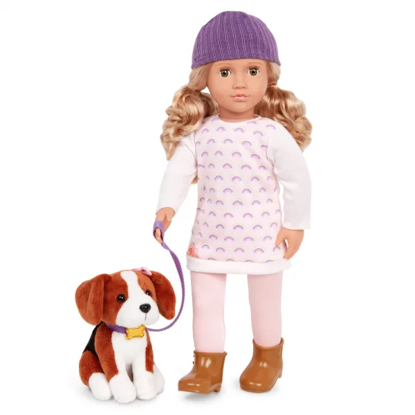 Игра с кученца и забавни дни ви очакват с 46-сантиметровата кукла Ембър от Our Generation и нейното кученце Елси! Ембър има гушкаво меко тяло и реалистични черти, от красивите ѝ лешникови очи, които се отварят и затварят, до дългата ѝ, вълниста руса коса, която е забавна за оформяне. Дръжте Елси удобно на кучешката възглавница, докато ѝ сервирате вкусно лакомство с купичките за храна и вода, играчката кокал и играчката за дъвчене. След това използвайте прикрепящата се каишка, за да разведете Елси навън! Игривото кученце на Ембър е 15-сантиметров бийгъл. То има мека плюшена козина и стилна панделка, която подхожда на тоалета на Ембър! Тя пристига облечена в сладък пуловер с дъгови принтове, клинове, шапка и ботуши. Когато стане време за преобличане, тоалетът ѝ има лесно отварящи се закопчалки за бързо обличане и събличане. Така че можете да комбинирате, съчетавате и създавате още забавни визии във всяко приключение!