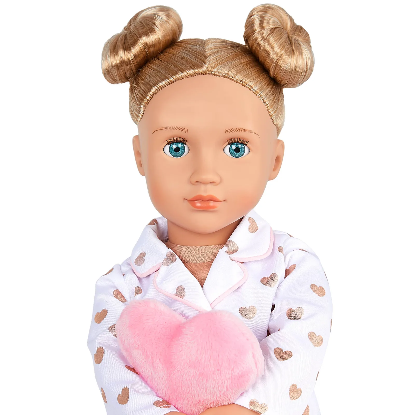 Гушкайте се и празнувайте приключенията с преспиване със Серенити! Тази 46-сантиметрова кукла от Our Generation има дълга руса коса, която е забавна за разресване и стилизиране, а яркосините ѝ очи се затварят, когато е време за сладки сънища! Серенити е готова за пижамено парти. Тя идва облечена в съответстващ пижамен тоалет с мини златист мотив на сърца и любимата си плюшена възглавничка във формата на сърца. А сладкият чифт пантофки ще ѝ помогне да се премести от леглото до масата за закуска! Тоалетът ѝ е с лесно отварящи се закопчалки за бързо обличане и събличане, така че Серенити може да комбинира, комбинира и започва всяко приключение в игриви стилове!
