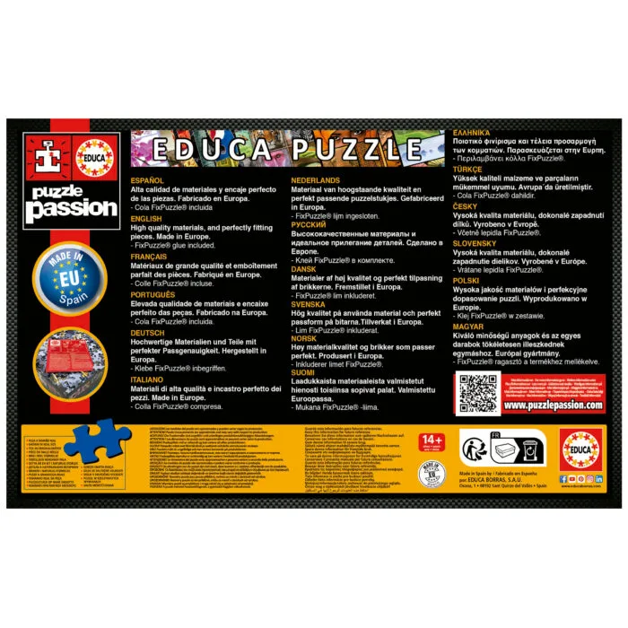 Educa® ви предлага най-пълната колекция от пъзели за възрастни на пазара, с размери от 500 до 42 000 части и с най-добрите картинки и най-забавните герои. Приблизителни размери на сглобения пъзел: 68 х 48 см. С всички пъзели от 500 до 2000 части (включително) ще получите безплатно специално лепило FIX PUZZLE®, за да запазите пъзела си, след като го сглобите.