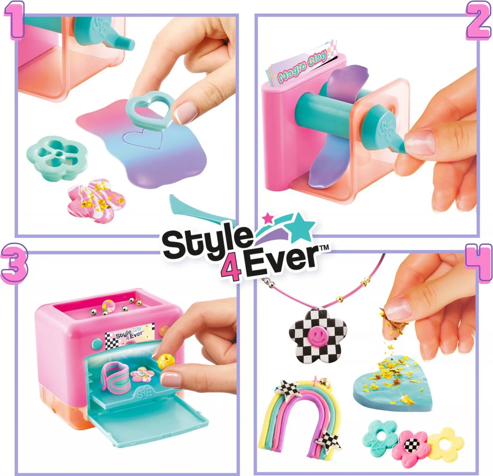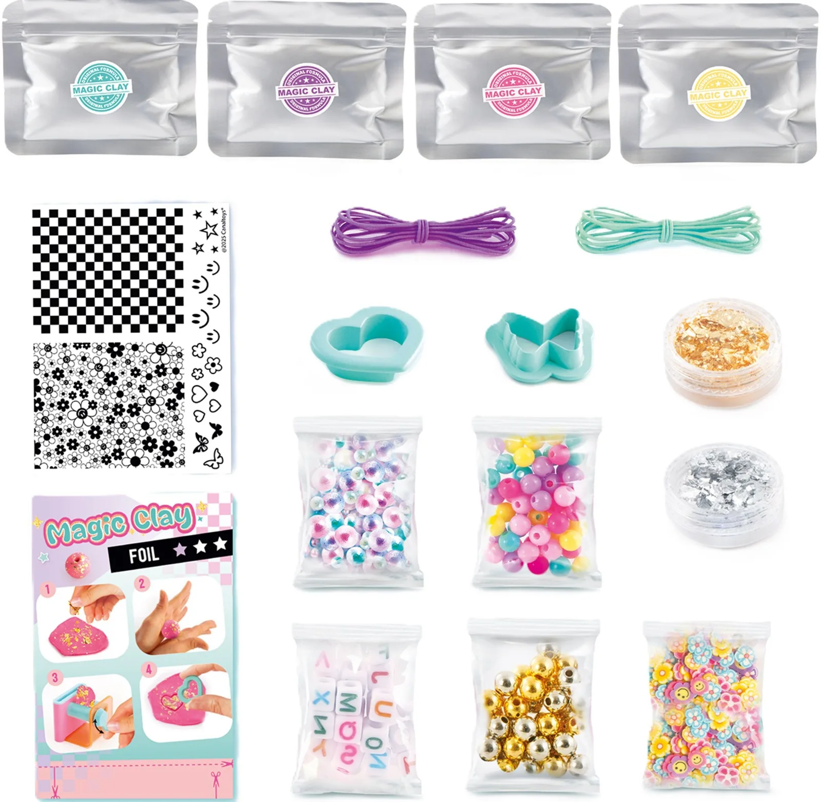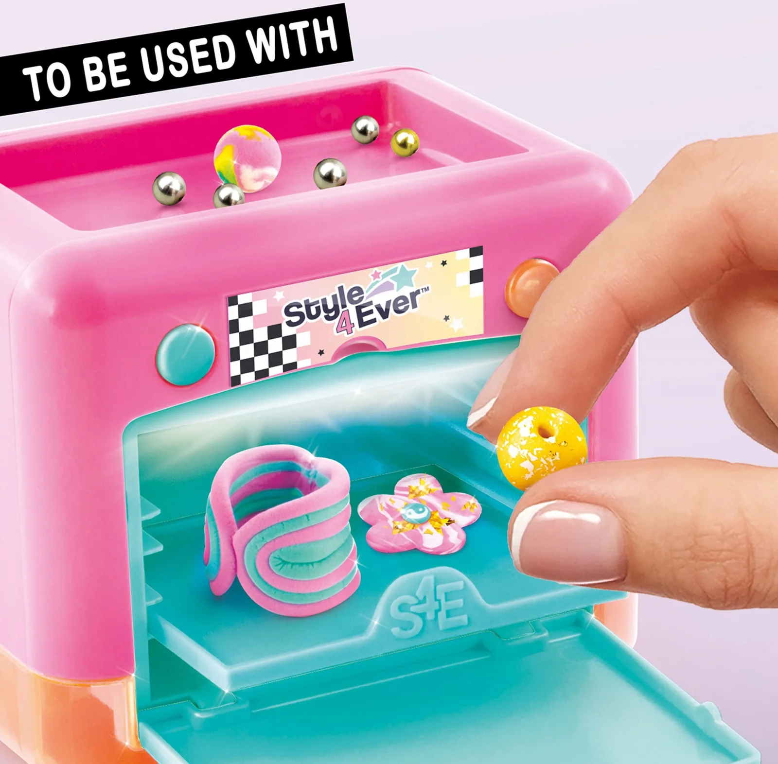 Този комплект за допълнение ви позволява да стигнете още по-далеч в създаването на вашите бижута. С 4-те торбички магическа глина, бурканчета с фолио, конци и всички включени аксесоари можете да създадете невероятни нови бижута. Смесвайте цветове, оформяйте вашите творения, добавяйте декорации и ги изпечете във фурната, за да създадете пръстени, висулки, гривни и други! Използвайте формички за сладки, мъниста, глинени декорации и скъпоценни камъни, за да персонализирате бижутата си по начина, по който искате. Ръководството ще ви помогне да използвате различните техники, за да постигнете още по-вълшебни резултати!