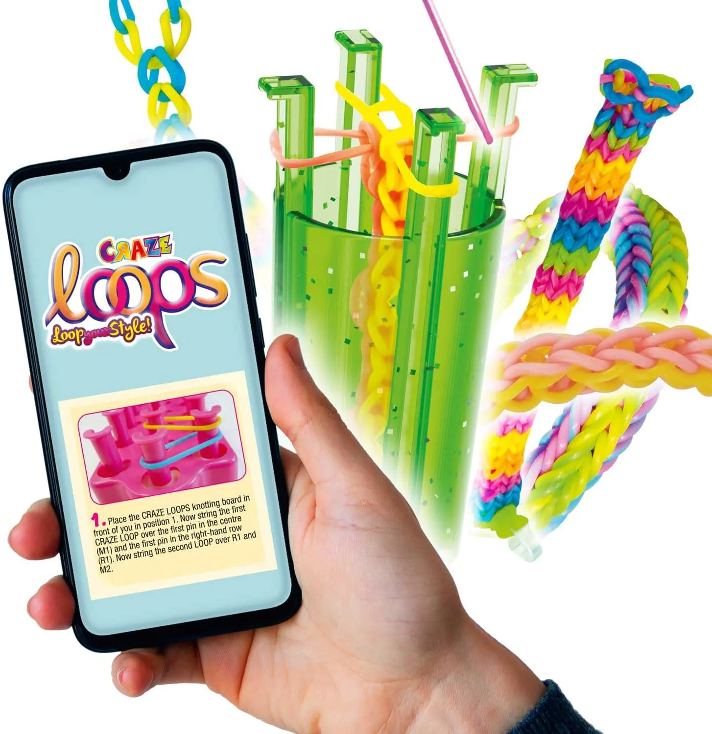 С Craze Loops няма граници за креативност! Създайте свои собствени бижута, като направите направете цветни гривни за приятелство и прекрасни ленти за плетене. Проектирайте и изплетете свои собствени гривни сами.