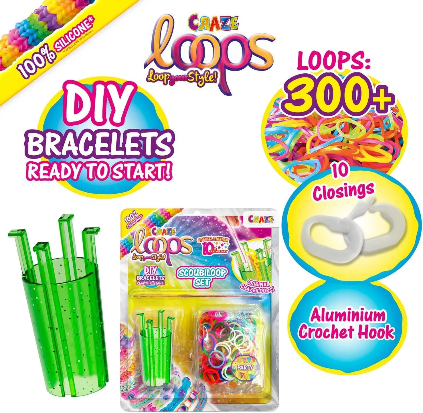 Новият комплект Craze Loops Scoubiloop прави връзването и плетенето на гривни два пъти по-забавно! Този комплект може да се допълва с всеки друг комплект Craze Loops.